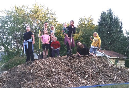 Here is a picture of me with my kids when we got a GIANT pile of wood chips for our permaculture garden that we were installing. I was expecting about one third of that volume. Too bad a third of it is still out there now in the middle of the lawn...